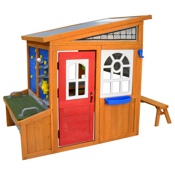 Domeček je vybaven rolovacími „garážovými“ vraty s klikou, kolíkovou stěnou a vnitřním vyvýšeným stolem s pracovní deskou pro ruční práce. Nechybí ani odkládací přihrádky různých velikostí, které pomáhají udržet pořádek. Venkovní úložný prostor lze využít také jako lavici k sezení nebo pracovní plochu.