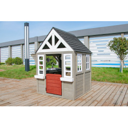 Kdo by netoužil po svém vlastním bydlení! Dopřejte svým dětem klidný kout, kde můžou odpočívat, mít soukromí a nerušeně si hrát. V tomto rozkošném domečku se budou cítit jako v pohádce. Velké boční okno nabízí krásný výhled do okolí a umožní proměnit domeček v prodejní stánek nebo obchod. V útulné kuchyňce, ve které nechybí varná deska s otočným červeným knoflíkem, dřez a základní nádobí, předvedou malí kuchaři a kuchařky své kulinářské dovednosti a připraví pro kamarády nebo rodiče chutné menu. Dalšími stylovými doplňky jsou hodiny, truhlíky po stranách vstupních dveří, ve kterých se budou krásně vyjímat květiny, praktický vstup pro pejska, který je překryt látkovým závěsem s motivem psí boudy. Domeček je vyroben ze dřeva a opatřen nátěrem v přírodních barvách. Bude skvělým doplňkem a ozdobou každé zahrady nebo menšího venkovního prostoru. Tak na co ještě čekáte? Pojďte dál a buďte tady jako doma!