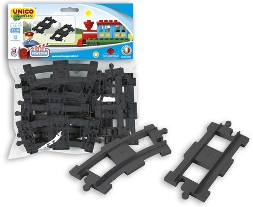 12 dielikov koľajníc vhodných k stavebnici Androni Unico Vlak. Vhodné pre deti od 18 mesiacov veku. Vyrobené v Taliansku. Kompatibilné so stavebnicami Lego DUPLO.