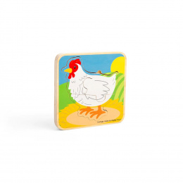 Dřevěné puzzle, které dětem ukáže životní cyklus slepice od vajíčka až po dospělost. Stačí odstranit všechny puzzle až na počátek životní etapy slepičky. Poté se postupně vkládají jednotlivé dílky dle velikosti. Objevuje kuřátko, jak roste, až do dospělosti. Děti se přitom naučí něco nového o zvířecí říši. Pomáhá rozvíjet obratnost, koordinaci oko-ruka a soustředění. Vhodné na doma i na cesty. Stavět ho můžou děti od roku a půl.