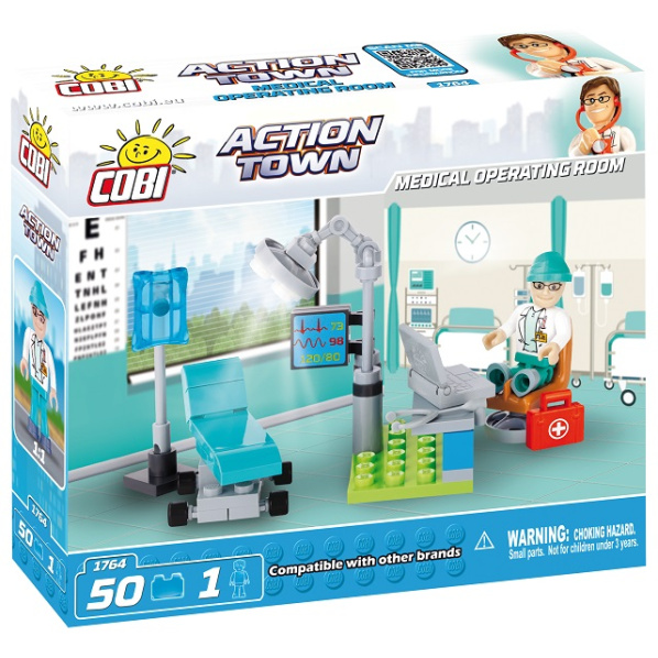Nový pacient na príjme si vyžaduje okamžitý zákrok. Lekár sa pripravuje na operáciu. Pomôžte mu pripraviť operačnú sálu – posteľ na kolieskach, otočnú stoličku, svetlo žiariace v tme a monitor EKG. Nesmie chýbať ani lekárnička, stetoskop a notebook. Balenie obsahuje 50 kociek a 1 figúrku lekára. COBI SA, ul. Jaskrów 11, 04-709 Warszawa, Polsko, kontakt@cobi.pl
