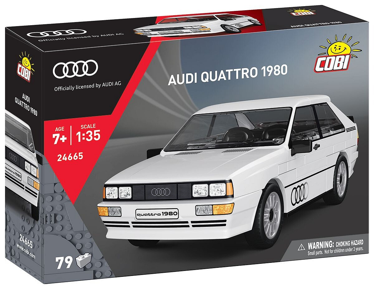 Postavte si Audi quattro (1980) v elegantnom bielom prevedení a oživ legendu rally! Tento model v mierke 1 : 35 obsahuje 79 kociek a po zostavení dosahuje rozmery 12,5 cm na dĺžku, 6,5 cm na šírku a 4,5 cm na výšku. Verné spracovanie zachytáva ikonickú siluetu s rozšírenými blatníkmi, športovou líniou karosérie a typickým dizajnom 80. rokov. Model ponúka realistické detaily, kvalitné spracovanie a trvácne potlače aj kvalitné nálepky. Vznikol na oficiálnej licencii Audi a je ideálny ako zberateľský model aj ako hračka.