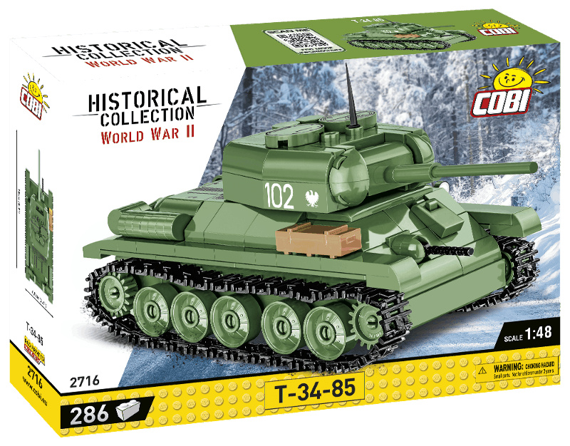 Postavte si model sovietskeho stredného tanku T 34-85 v mierke 1:48. Model disponuje mnohými pohyblivými prvkami, ako sú ako funkčný pásový podvozok, otočná veža a rozmer kanónu. Zostavený model sa skladá z 286 dielikov a meria 15 cm na dĺžku, 6,5 cm na šírku a 7 cm na výšku. Kocky COBI sú plne kompatibilné so stavebnicami LEGO.