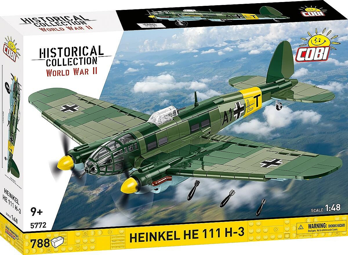 Postavte si model Heinkel He 111 H-3, jeden z najikonickejších bombardérov druhej svetovej vojny. Tento model v mierke 1 : 48 obsahuje 788 kociek a po zostavení dosahuje rozmery 34 cm na dĺžku, 46 cm na šírku a 9 cm na výšku (na podstavci cca 15 cm na výšku). Ponúka pohyblivé vrtule, kolesá s gumovými pneumatikami a ďalšie funkčné prvky, ktoré zvyšujú realistickosť modelu. Súčasťou je aj bombová výzbroj SC 50 umiestnená v pumovnici, výstavný podstavec s tabuľkou a trvácne potlače bez použitia nálepiek, ktoré zabezpečujú dlhodobý vzhľad modelu.