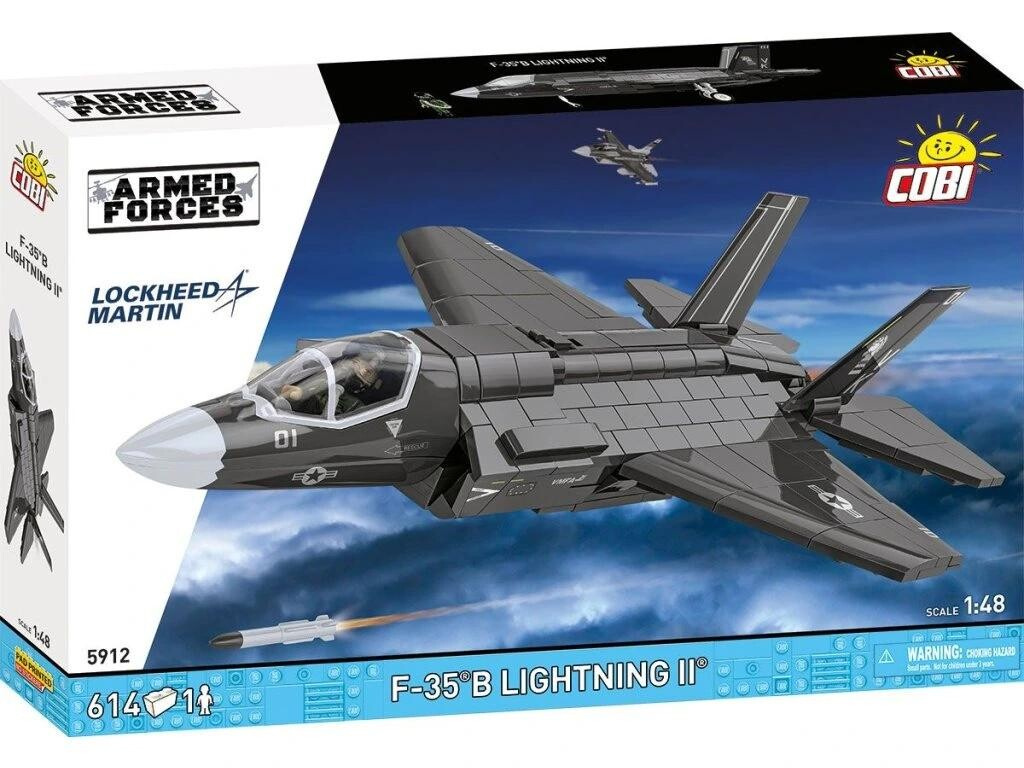 Zostavte si moderný bojový lietadlový F-35B Lightning II v mierke 1:48 zo 614 dielikov. Model je detailne spracovaný na základe originálnej licencie Lockheed Martin a verne zachytáva charakteristický vzhľad tejto viacúčelovej stíhačky. Obsahuje autentické potlače (bez nálepiek), otvárateľný kokpit pilota, pohyblivé riadiace plochy, gumené kolieska, figúrku pilota s helmou a kyslíkovou maskou, a taktiež stojan s tlačeným štítkom. Súčasťou je aj výzbroj – napríklad riadené strely AGM-88G. Rozmery hotového modelu: 32,5 cm (d) × 21,5 cm (š) × 9,5 cm (v).