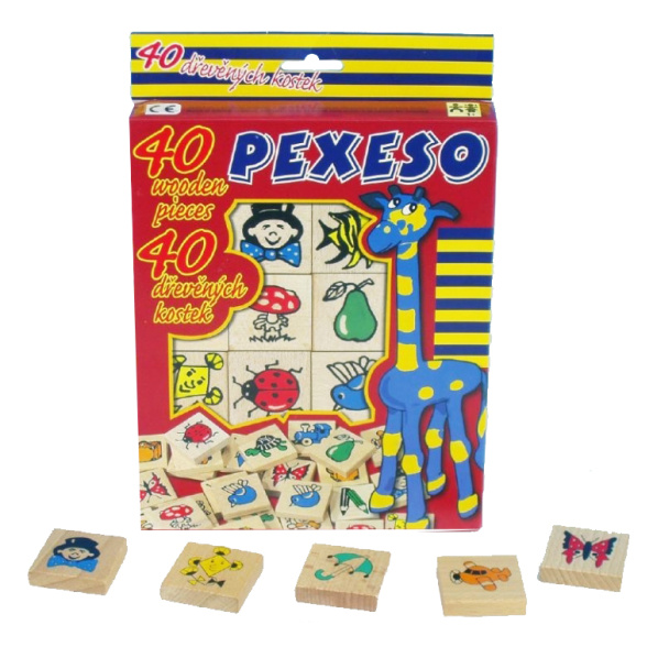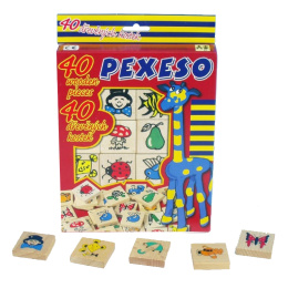 Drevené pexeso s farebnými obrázkami na precvičenie sústredenia a pamäti. Hra obsahuje 40 kusov veľkosti 40 × 40 × 10 mm. Balené v škatuli z tvrdého papiera. Nevhodné pre deti do 3 rokov. Obsahuje malé časti. Výrobok je zdravotne bezchybný.