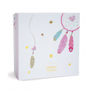 Plyšový muchláček doprovází miminko od narození, aby mu přinesl hebkost, pohodlí a objetí. Rozvíjí smysly a zvědavost. Díky jemným harmoniím trendy barev, směsím velmi jemných materiálů bude tato sada lákat malé i větší děti. Pro miminko bude mít především uklidňující efekt. Je to velmi pěkný dárek k Vánocům nebo k oslavě narození miminka. Muchláček je posazen do nádherné dárkové krabičky s grafikou evokující modernost i luxus.
