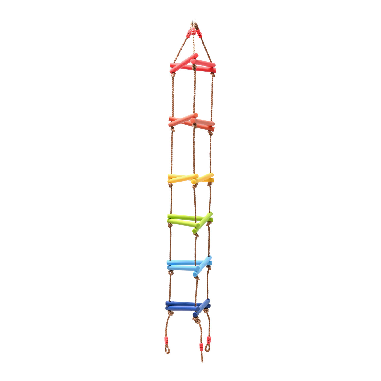 Pestrobarevný plastový žebřík o třech stranách nabízí provedení odolné povětrnostním vlivům. Je vybaven kovovým okem k zavěšení. Hravě jím zpestříte dětské hřiště, nebo domeček na stromě.