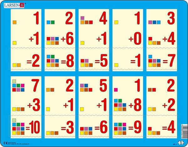 Výučbové puzzle pre deti s početnými príkladmi na precvičovanie sčítania do desať. Je vhodné aj pre mladšie deti, ktoré nerozpoznajú číslice, keďže pri každom čísle je znázornený príslušný počet štvorčekov. Dieťa má za úlohu doplniť výsledok, pričom dieliky je možné umiestniť iba v prípade, že je úloha vyriešená správne.