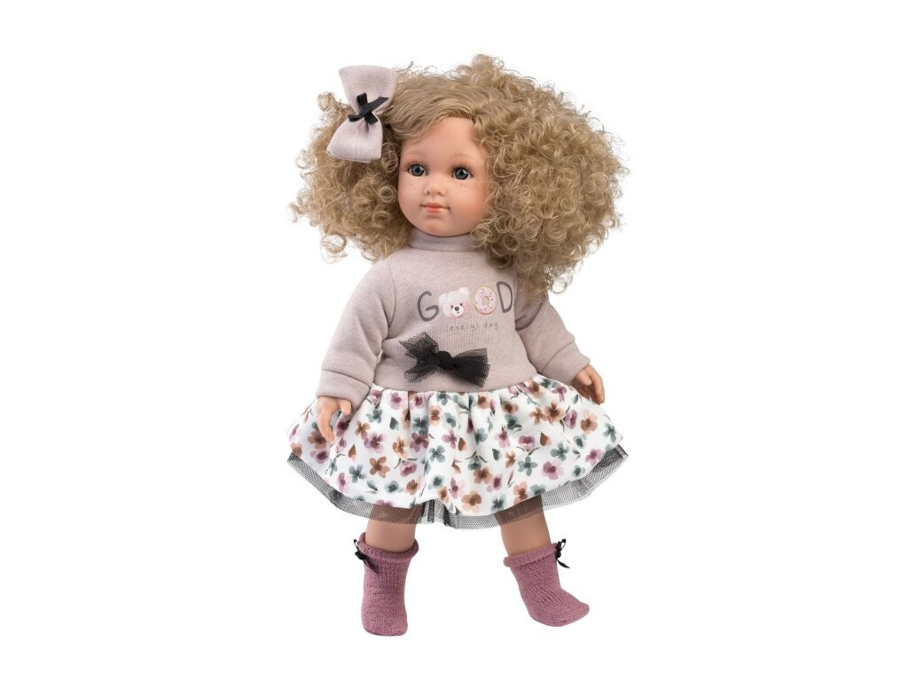 Bábika bez zvuku s látkovým telom a vláskami porastenými po celej hlave, podobajúca sa malej slečne. Veľkosť 35 cm.