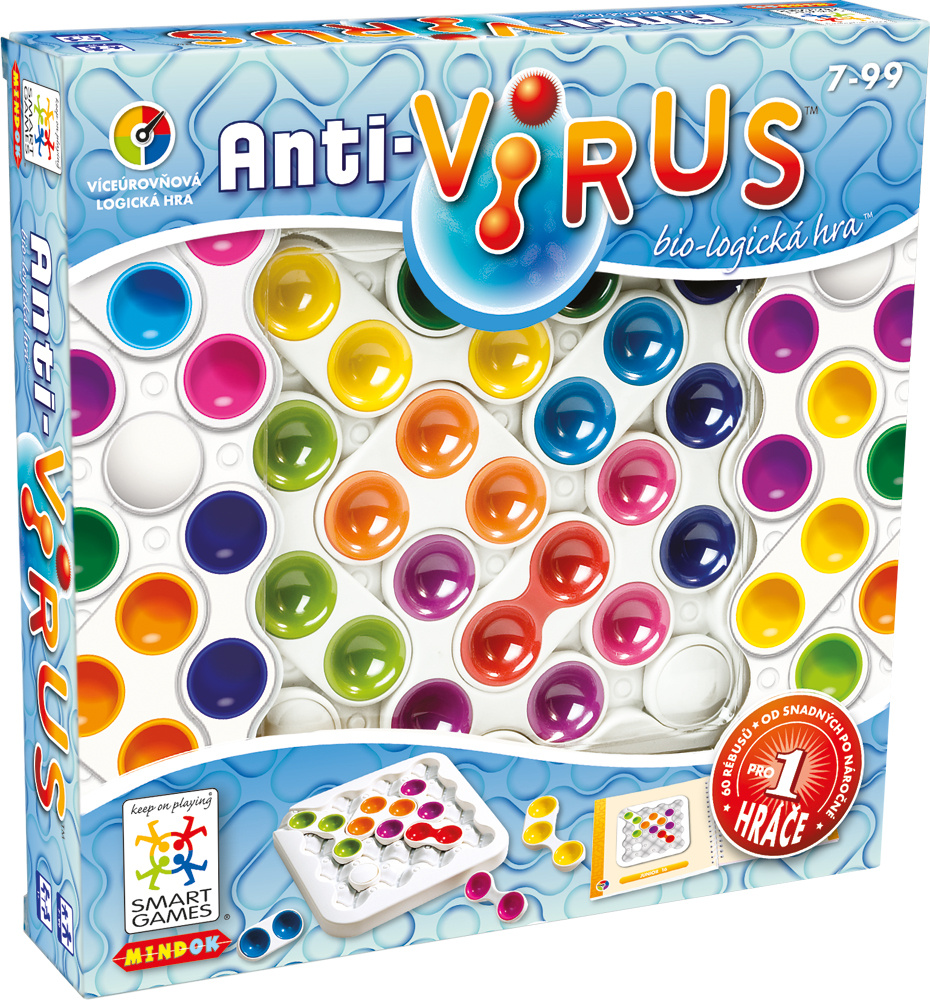 Hlavolamová hra pre 1 hráča z radu SMART games. Zapojte svoje telo i myseľ a zbavte sa zákerného vírusu! Zákerný vírus napadol bunku ľudského tela. Dokážete sa ho zbaviť skôr, než sa rozmnoží a napadne ďalšie bunky? Táto hra je ešte väčšou výzvou, než to na prvý pohľad vyzerá. Dokážete si predstaviť, že vnútri bunky práve nie je veľa miesta? Vírus a ďalšie molekuly sa stále blokujú a prekážajú si v ceste. Navyše sa môžu pohybovať i v skupinách a hýbu sa iba diagonálne. Nikto neodolá tejto nákazlivej zábave. 60 rébusov vám prinesie dlhé hodiny zábavy. Cestovný váčok vám umožní vziať si hru kamkoľvek so sebou. MINDOK s.r.o., Korunní 810, 101 00 Praha 10, info@mindok.cz