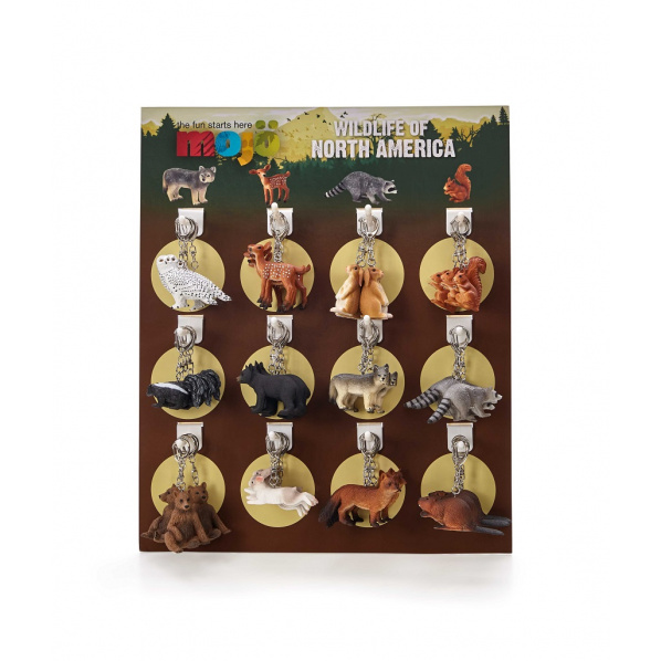 Displej obsahuje 72 ks přívěsků na klíče lesních zvířatek žijících v Severní Americe. Přívěsek lze použít jako stylový doplněk na klíče nebo jako malý dárek k narozeninám.