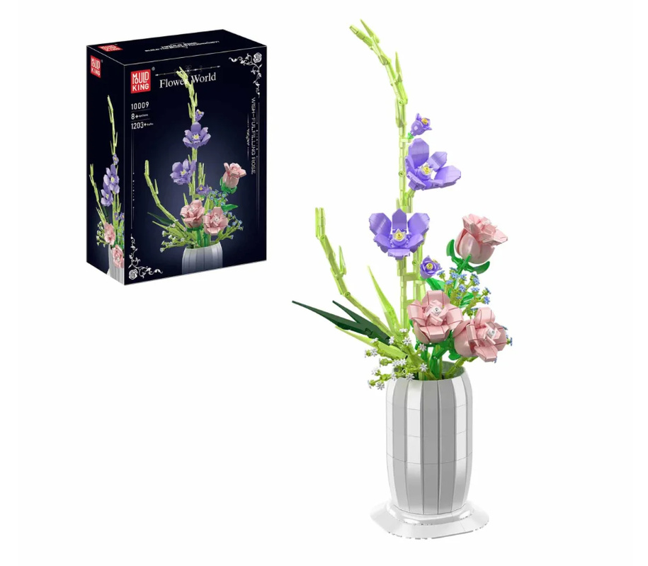 Kvetinové súpravy Mould King sú nielen realistické, ale majú aj jedinečnú výhodu - kvety z blokov zostanú kvitnúť navždy. Farebná kytica je umiestnená v bielej váze. Ruže, mečíky a vázu možno zostaviť zo 1203 dielikov a výsledná kvetinová dekorácia bude vysoká 57,5 cm.