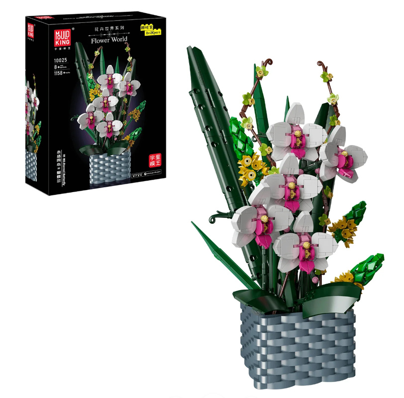 Stavebnice kvetov značky Mould King sú nielen realistické, ale majú aj jedinečnú výhodu - kvety z kociek zostanú kvitnúť večne. Farebná kytica je umiestnená v bielej váze. Orchidey a vázu je možné zostaviť zo 1158 dielikov a výsledná kvetinová dekorácia bude mať výšku 45 cm.