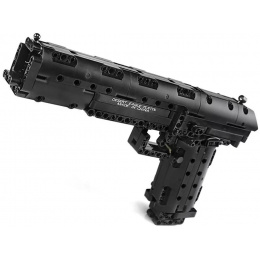 Pištoľ dokáže vystreliť plastový projektil nie priamo z hlavne, ale z otvoru umiestneného pod hlavňou. Táto stavebnica je len modelom, a preto je výstrel neškodný a bezpečný. Aj napriek tomu vždy dodržiavajte zásady bezpečnej hry a nemierte do očí ani do tváre.