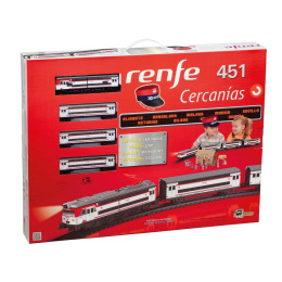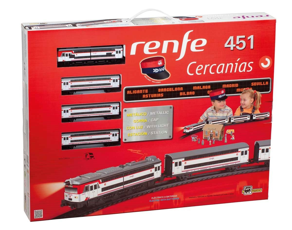 Kovový osobný vlak na batérie so svetlami, 3 vagónmi, železničnou stanicou a čiapkou prednostu stanice. Vlak jazdí po trati dlhej 4,4 m. Cercanías je španielsky osobný vlak prevádzkovaný španielskou železničnou spoločnosťou Renfe.