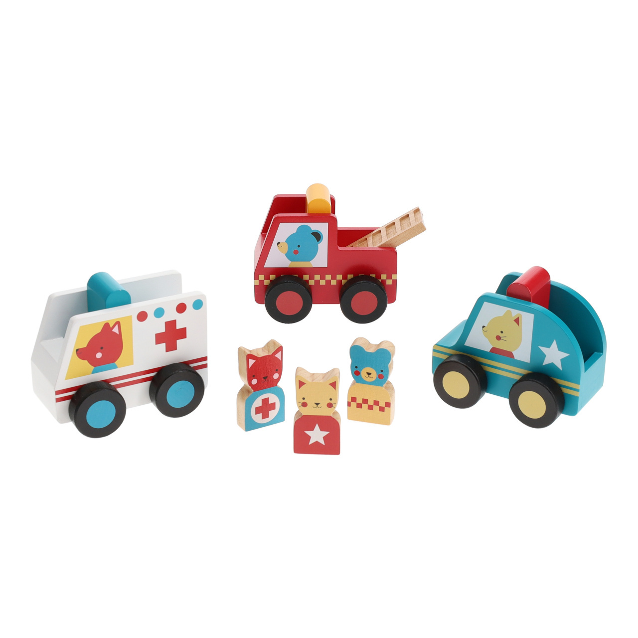Pro všechny, kdo jsou připraveni vyrazit na pomoc. Souprava záchranářských autíček obsahuje hasičské auto, sanitku a policii. Každé autíčko je doprovázeno figurkou zvířecího řidiče, medvídkem, lištičkou a kotětem. Autíčka jsou robustní a odolná, vše vyrobeno z udržitelně získaných materiálů.