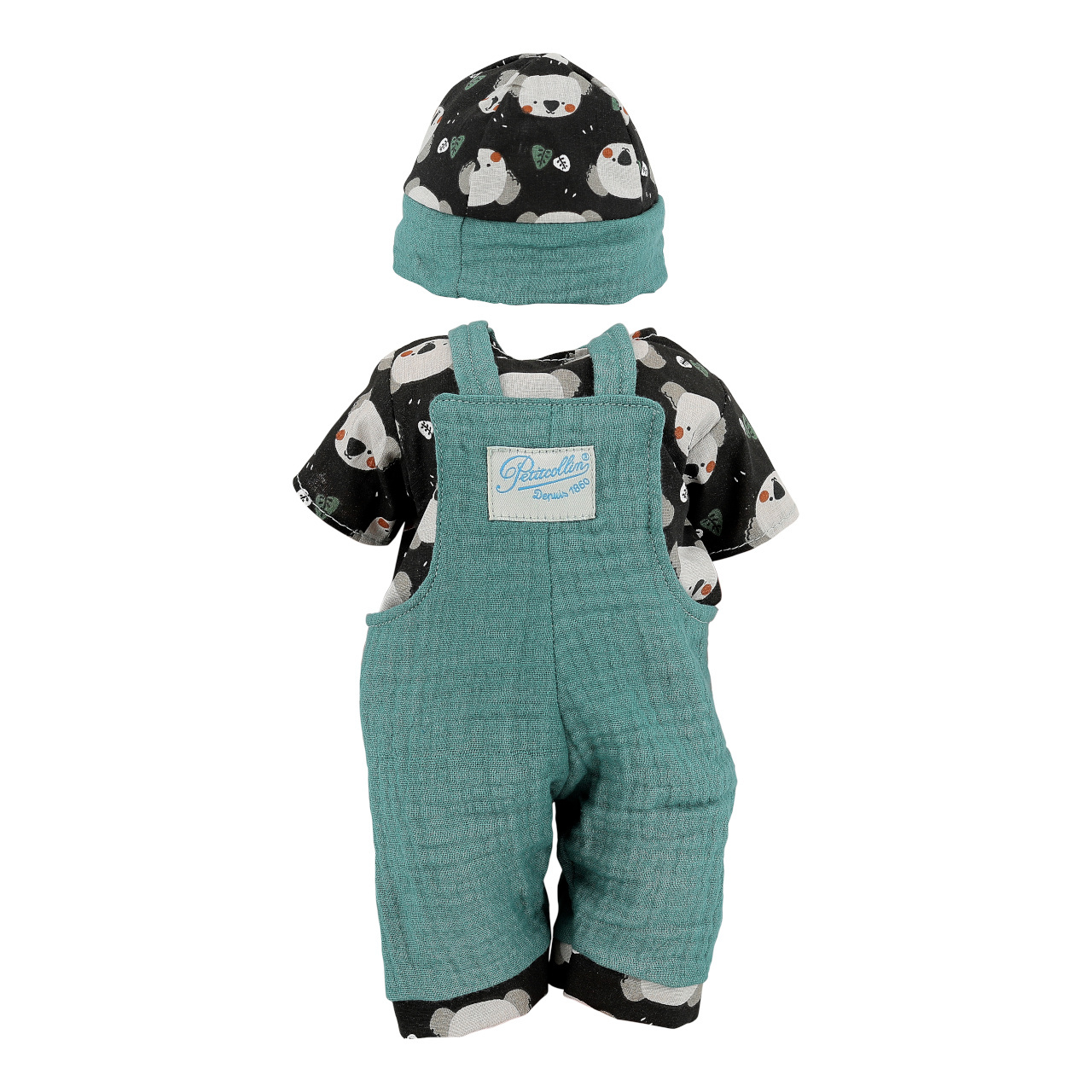 Obleček určený zejména pro panenky Petitcollin řady Petit Câlin. Skládá se ze zelených kalhot, vzorovaného černého trička a stejně barevné čepičky. Oblečky Petitcollin jsou pečlivě zpracované, vynikají francouzskou elegancí, jedinečnou barevností a vzory, díky kterým jsou poutavé a nezaměnitelné. Dodáváno v papírové krabičce s průhledem a plastovým ramínkem.