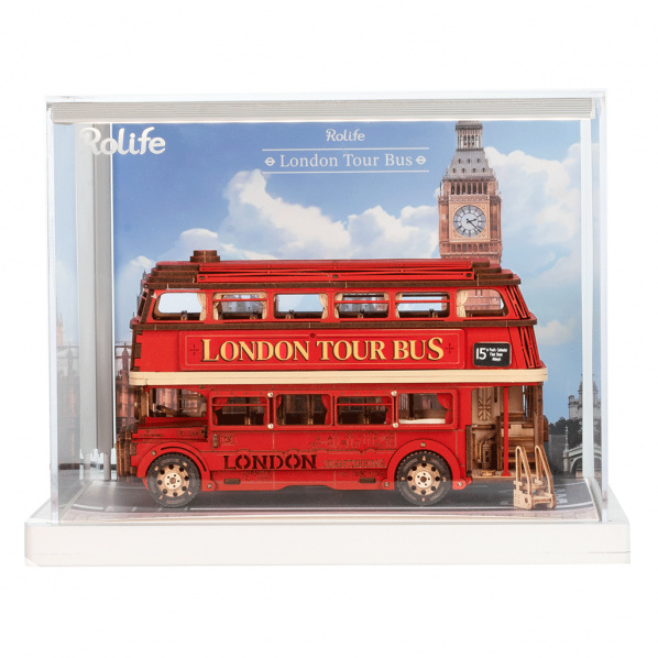 Pokud Vás nebaví skládačky nebo na ně nemáte čas, ale chtěli byste mít v obývacím pokoji či v kanceláři stylovou dekoraci, displej s poskládaným londýnským double-deckerem je pro Vás ideální. Londýnský double-decker je výsledkem 3D dřevěné skládačky TGM02. Plastový box chrání před prachem a nečistotami a tento jedinečný kousek v něm krásně vynikne.
