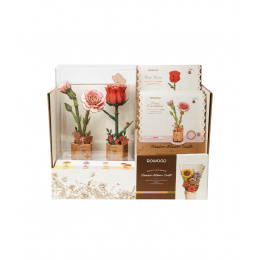 V levé části kartonového displeje je umístěn průhledný plastový box se 2 složenými květinami – červenou růží a růžovým karafiátem. V pravé části jsou 2 přihrádky, do každé se vejde až 10 ks 3D dřevěných skládaček těchto květin (TW042 - 3D dřevěná skládačka Červená růže, TW051 - 3D dřevěná skládačka Růžový karafiát).