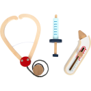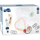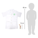 Kompletní hrací sada s lékařským plášťem a zdravotnickým vybavením. Najdete zde injekční stříkačku, stetoskop a teploměr z robustního dřeva. Píst stříkačky se po stlačení zatáhne. Teploměr má nastavitelný ukazatel teploty. Lékařský plášť má dvě praktické kapsy, zapíná se na patentky, takže si jej mohou mladí medici rychle obléct i svléct. Ideální hračka pro hraní na role nebo jako kostým na karneval. Vhodné pro děti, které jsou vysoké 105-110 cm (vel. 110). Ideální doplněk k doktorské brašně a dalším podobným produktům.