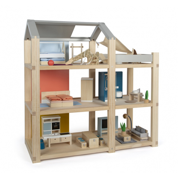 Tento veľký drevený domček pre bábiky v škandinávskom štýle s troma podlažiami a priestrannou strešnou terasou sa stane nielen zábavnou a kreatívnou hračkou, ale aj interiérovým doplnkom, ktorý sa bude vynímať v každej izbičke. Domček má tri podlažia. Skladá sa z útulnej spálne, detskej izby so žirafiou šmykľavkou, štýlovej kúpeľne, modernej kuchyne, očarujúce jedálne, útulnej obývacej izby, priestrannej strešnej terasy a je kompletne zariadený detailne prepracovaným nábytkom pre bábiky. Vďaka posuvným zadným stenám je možné znova a znova meniť vzhľad interiéru. Steny sú totiž obojstranne použiteľné, z jednej strany majú vzhľad prírodného dreva, z druhej strany sú opatrené farebným náterom. Domček je ihneď pripravený k hre - nie je už potrebné žiadne ďalšie príslušenstvo.