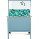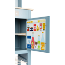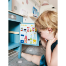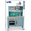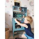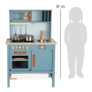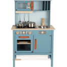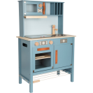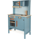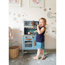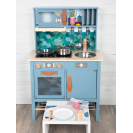 Moderní dětská kuchyňka s robustní konstrukcí v trendy kouřově modré barvě, v kombinaci se stylovými koženými madly v koňakové barvě. Okamžitě připravena k hraní s přiloženým hrncem s poklicí, pánví a kovovým kuchyňským náčiním. Dodává se s kovovým dřezem a otočnými knoflíky, které vydávají zvuk. Součástí je elektronická varná deska se světlem/zvukem a zatahovací digestoří se světelným symbolem. 2v1, vyjímatelný pekáč lze použít také jako tabuli. Povrchy v chladničce a troubě jsou potištěné kuchyňskými detaily pro větší zábavu při hraní. Oboustranný zadní panel s vysoce kvalitním potiskem ve vzhledu dlaždic nebo jednoduché modré barvě. Lze perfektně doplnit dalšími výrobky a kuchyňskými spotřebiči z kolekce Tasty.