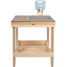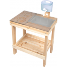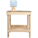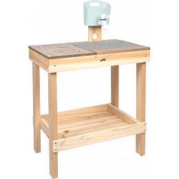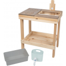 Rozměry: 52x35x79 cm Výška pracovní plochy: 56 cm Věk: 3+ Materiál: dřevo, plast Obsah balení: venkovní kuchyňka, plastový dřez, dávkovač vody s kohoutkem