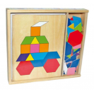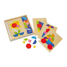 Na 4 kartách sú zobrazené motívy, ktoré majú byť skopírované pomocou mozaiky. Drevená hračka mozaika je uschovaná v škatuľke s posuvným vekom.