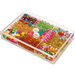 Rozměry: 18x12x3 cm Věk: 3+ Materiál: plast Praktický třídící box s 9 oddíly, které obsahují korálky různých tvarů a různých barev. S korálky a uzávěry se dají vytvářet skvělé variace šperků! Hlavní vlastnosti: box s 9 oddíly
