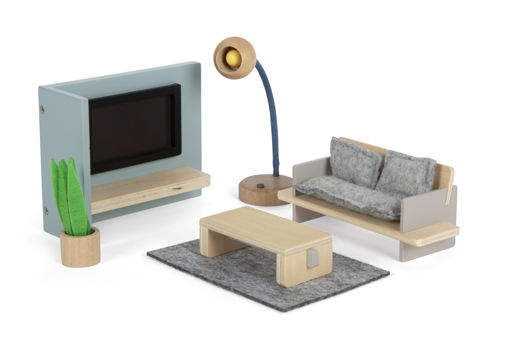 Chcete pozrieť na televíziu alebo len tak posedieť na pohovke? Táto obývacia izba je nielen krásnym doplnkom pre každý domček pre bábiky, ale taktiež motivuje deti ku kreatívnej hre a rozvíja ich predstavivosť. Je vyrobený tak, aby čo najviac zodpovedal skutočnému nábytku. Súčasťou je pohovka s 3 vankúšmi, ohybná vysoká stojaca lampa, príjemný koberček, konferenčný stolík, rastlina v kvetináči, panel s televíziou s plochou obrazovkou a policou a 2 obojstranné karty s obrázkom. Kartu je možné zasunúť do priestoru televízie ako obrazovku a deti si tak môžu zmeniť televízny program.