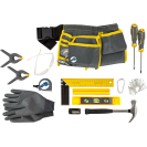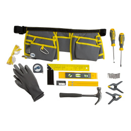 S tímto robustním opaskem na nářadí budou mít děti své nástroje vždy po ruce. Ať už je to tesařské kladivo, plochý nebo křížový Phillips šroubovák, kovový tesařský úhelník, ochranné brýle, pracovní PU rukavice, pérové svěrky a hřebíky, tužka a strouhátko nebo měřící páska. Tento obsáhlý set musí mít každý mladý kutil nebo kutilka. Nastavitelný opasek se zapínáním na přezku má 8 přihrádek, poutko na kladivo, také karabinu. Vodováha má na straně magnetický pásek, je univerzální – dokáže měřit vodorovně, svisle i ve 45°. Kladivo má gumové madlo, aby nevyklouzlo dětem z ruky. Šroubování, zabíjení kladivem, měření, náčrty, to vše trénuje zručnost dětí. Realistické nářadí pro děti bude perfektní pomůckou pro jejich první projekt. Opasek je ideální pro větší děti.