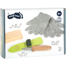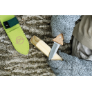 Chceš štípat klacíky, krájet ovoce nebo si připravit klacek na opékání? S outdoorovým dětským nožem to není žádný problém! Díky krátké, robustní čepeli s tupou špičkou, kompaktním rozměrům a dřevěné rukojeti dokonale tvarované pro dětské ruce mohou děti získat první zkušenosti s vyřezáváním a manipulací s nožem. Nůž je bezpečně uložen v látkovém pouzdře s háčky a poutky pro připevnění k opasku. Sadu doplňuje pár speciálních rukavic odolných proti pořezání a dřevěný řezací špalíček. Čepel tohoto outdoorového nože je ostrá, protože tupé čepele nejsou v žádném případě bezpečnější než ostré! Při řezání tupým nožem musíte použít mnohem více síly, což zvyšuje riziko vyklouznutí nože a zranění. Dětské nože na vyřezávání by samozřejmě měly být i tak vždy používány pod dohledem dospělých a v rámci pevně stanovených pravidel. Nože nejsou hračky, ale nástroje! Jsou ideální pro výlety do přírody, dobrodružství a expedice - protože s dětským outdoorovým a průzkumným vybavením se svět za dveřmi stane vzrušujícím místem plným dobrodružství!