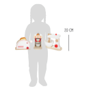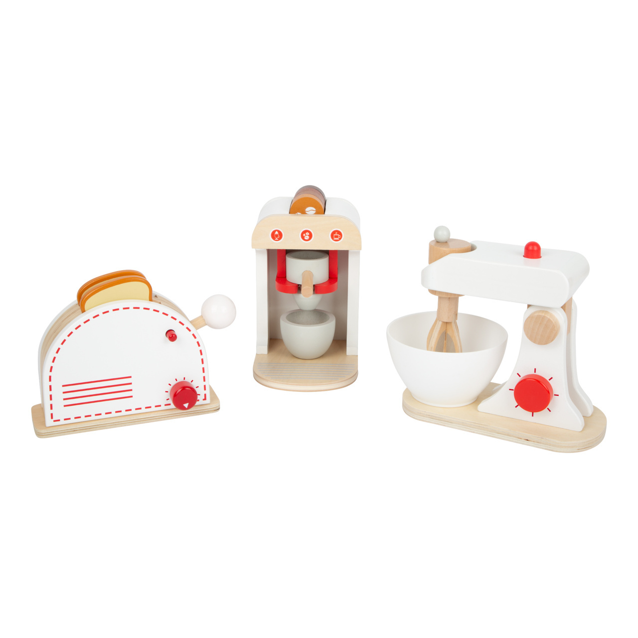 Kompletní sada populárních kuchyňských spotřebičů! Tato sada nabízí toaster, kávovar a mixér, takže vše, co potřebuje každá správná kuchyň. Dřevěné spotřebiče děti podporují ve hře na role, jsou také velmi realistické. Mají klikající ciferníky, toaster má také páčku, kterou „vystřelíte“ opečené toasty, metla mixéru se otáčí. Kávovar má různě silná kávová zrna, takže si můžete udělat espresso, cappuccino nebo latte.