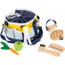 Pomůcky na čištění koní jsou dokonale přizpůsobeny potřebám mladých fanoušků koní, takže mladí jezdci mohou při hře popustit uzdu své fantazii. Pohodlná stahovací šňůrka umožňuje tašku doširoka otevřít, ale také úplně zavřít. Tuto tašku pro děti lze nosit za obě uši nebo nastavitelný ramenní popruh. S touto sadou péče se mohou děti starat o svého oblíbeného koně stejně jako profesionálové.