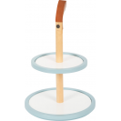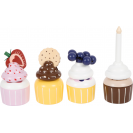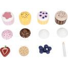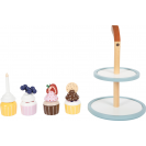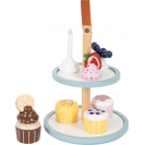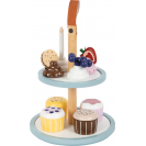 Lahůdky do dětské kuchyňky. Tento stojan se čtyřmi košíčky zve malé cukráře k aktivnímu hraní a prezentování lahodných muffinů. Stojan má dvě patra, které slouží k vystavení cukrovinek ve vrstvách. Systém kombinovatelných podstavců a krémových vršků umožňuje široké možnosti kombinací. Jednotlivé dílky společně drží pomocí integrovaných magnetů. Sada je doplněna o dvojitou sušenku, jahodový řez, borůvky a narozeninovou svíčku, kterou lze dorty ozdobit. To povzbudí chuť na čaj s panenkami, medvídky atd.