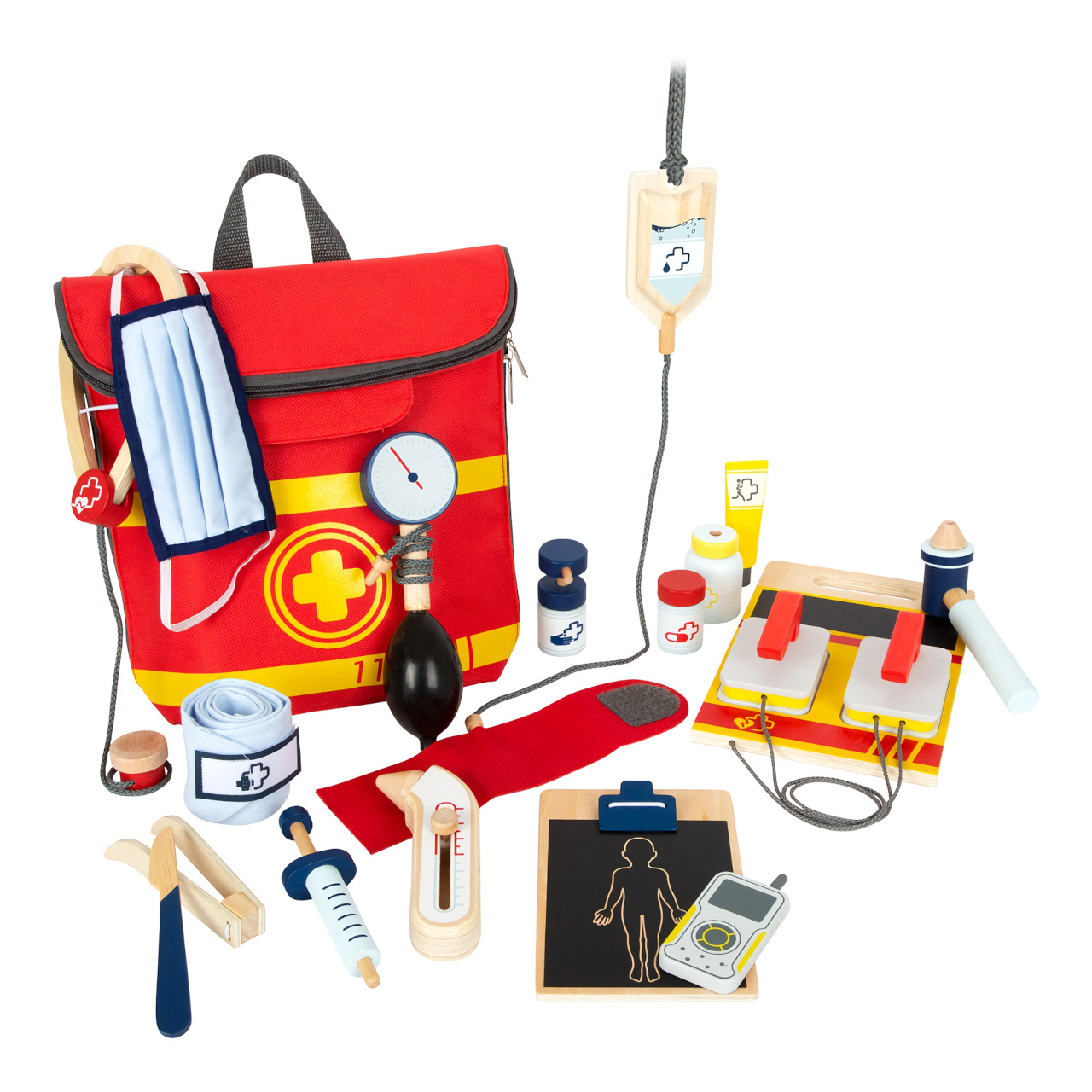 Vše pro naléhavé případy! Tento realistický batoh pro záchranáře má jasné barvy, nastavitelné popruhy a mladí záchranáři v něm najdou všechny „opravdové“ lékařské pomůcky. Dvojitý zip a uvnitř elastické kapsy nabízí mnoho úložného prostoru a rychlý přístup k záchranářským pomůckám z pevného dřeva. Nejlepšími doplňky jsou zřejmě tlakoměr s manžetou a balónkem, otoskop s lupou a defibrilátor s tabulkou pro křídu. Tento inovativní a obsáhlý set lékařských hraček obsahuje mnoho „opravdových“ lékařských nástrojů a přístrojů, s kterými si děti opravdu vyhrají, to vše v jednom batohu. Dále v batohu najdete teploměr, dětské textilní roušky, ampule s otvorem pro vložení stříkačky pro případ nouze, dezinfekční sprej s pumpičkou, infúzi, náplasti na suchý zip, stetoskop, injekční stříkačku s pohyblivým mechanismem, skalpel, pinzetu a rádio. S těmito pevnými hračkami mohou děti objevovat a zkoušet, jaké je to být záchranářem. Ilustrace na lékařských pomůckách dětem poradí rozeznat nástroje a také jim možná zjednoduší jejich použití.