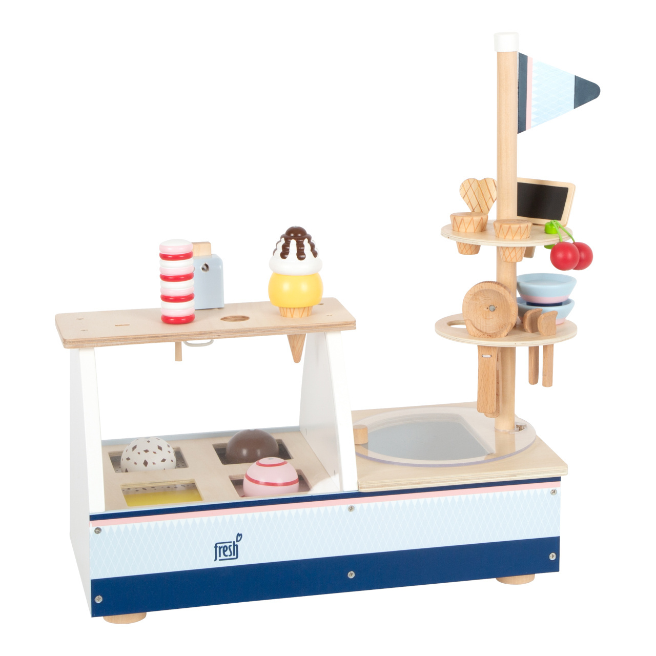 Jdeme na zmrzlinu! Tento dřevěný zmrzlinový set je perfektní na léto i zimu. Zmrzlinový stánek je modro-růžový, má také prvky přírodního dřeva, zákazníky nadchne velkým výběrem dezertů a svými funkcemi a příslušenstvím. Můžete si dát více kopečků zmrzliny, nanuk, točenou zmrzlinu, poháry, wafle... a to vše ozdobit třešničkou. Stánek má také plastovou vitrínu, mrazničku s plastovým poklopem, stojan na kornouty. Kopečky zmrzliny a točená zmrzlina jsou magnetické, v balení také najdete tabulku, na kterou můžete psát křídou. Zmrzlinu (vanilku, čokoládu, stracciatellu a jahodu) můžete z vitríny vyndat a dát ji do misky nebo kornoutu. Všechny se také vejdou na wafli. Vytvořte si dezert dle svého gusta. Zmrzlinový stánek má také úložný prostor.