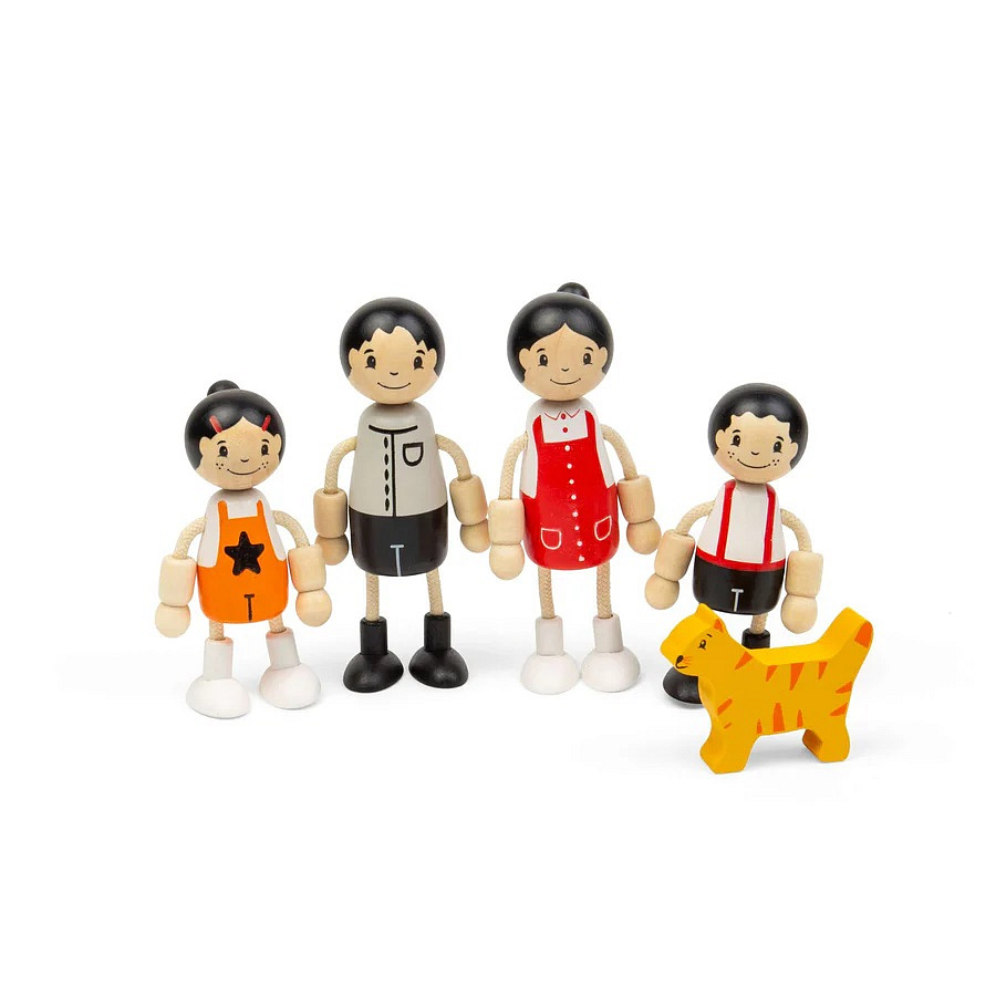 Oživte domeček pro panenky touto milou rodinnou sadou! Dřevěné figurky představují čtyřčlennou rodinu - maminku, tatínka a dvě děti - nechybí ani kočka jako jejich věrný společník. Panenky mají ohebné ruce a nohy, takže si děti mohou snadno přehrávat každodenní situace i vlastní příběhy. Hra s figurkami podporuje rozvoj fantazie, empatie a sociálních dovedností, a zároveň pomáhá dětem lépe porozumět světu kolem sebe. Sada je vyrobena z kvalitního FSC® certifikovaného dřeva z udržitelných zdrojů a je barvena netoxickými barvami a laky, takže je bezpečná pro malé děti. Skvěle se hodí jako doplněk k domečkům pro panenky a dalším herním sadám.