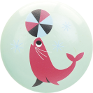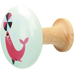 Set dřevěných věšáčků, jeden s ilustrací lachtana, druhý modrý s vločkami. Navrženo Ingelou P. Arrhenius. Vyrobeno z lakovaného dřeva ve Francii.
